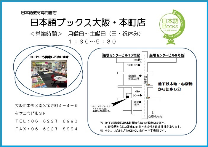 (大阪・本町店) 月~土(日・祝休み) 午後1時30分~午後5時30分